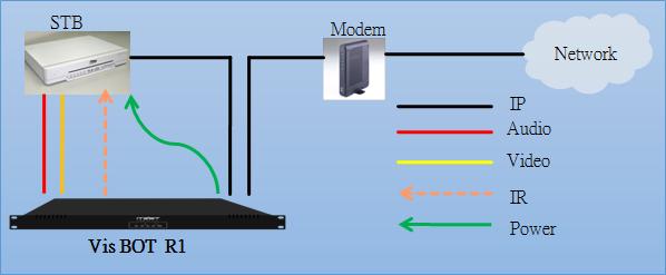 艾策研發(fā)的基于人工智能撥測的設(shè)備稱作VisBOT,其連接圖如圖1所示。作為一種撥測工具,可代替人、遙控器和電視機的位置,VisBOT與機頂盒有音視頻線、網(wǎng)線、紅外和電源連接。撥測設(shè)備的特征如下: