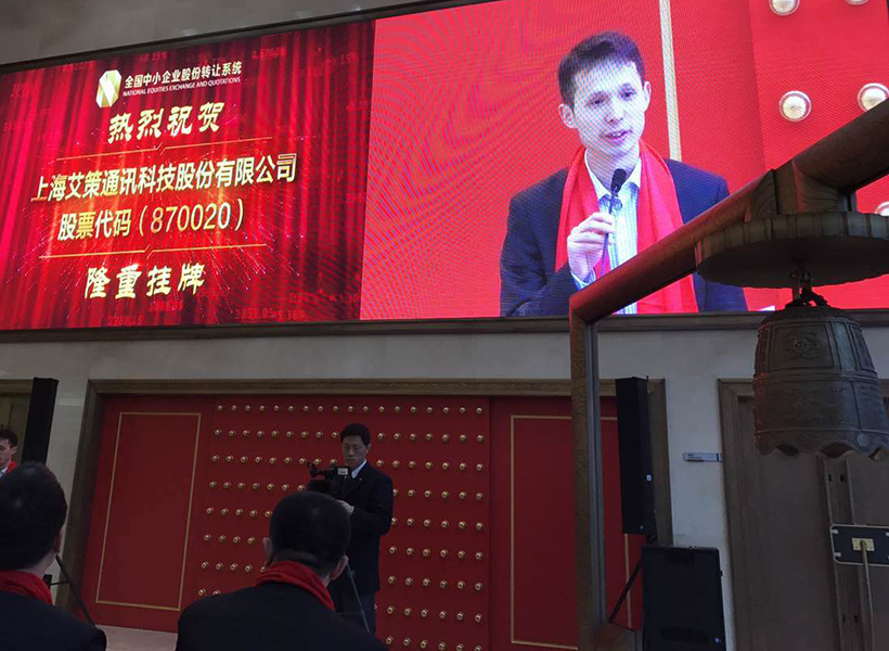 2017年1月5日上午10時,上海艾策通訊科技股份有限公司(簡稱“艾策通訊”)在北京全國中小企業(yè)股份轉讓系統(tǒng)交易中心舉行了掛牌敲鐘儀式(股票代碼870020),這一儀式也標志著公司開啟了一個全新的時代,是公司發(fā)展史上的一個重要的里程碑。
