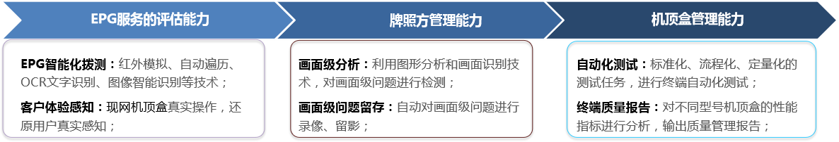 畫面級的智能識別能力:對回傳視頻開展圖片比對、OCR文字識別等技術,實現EPG可用性的智能化撥測。