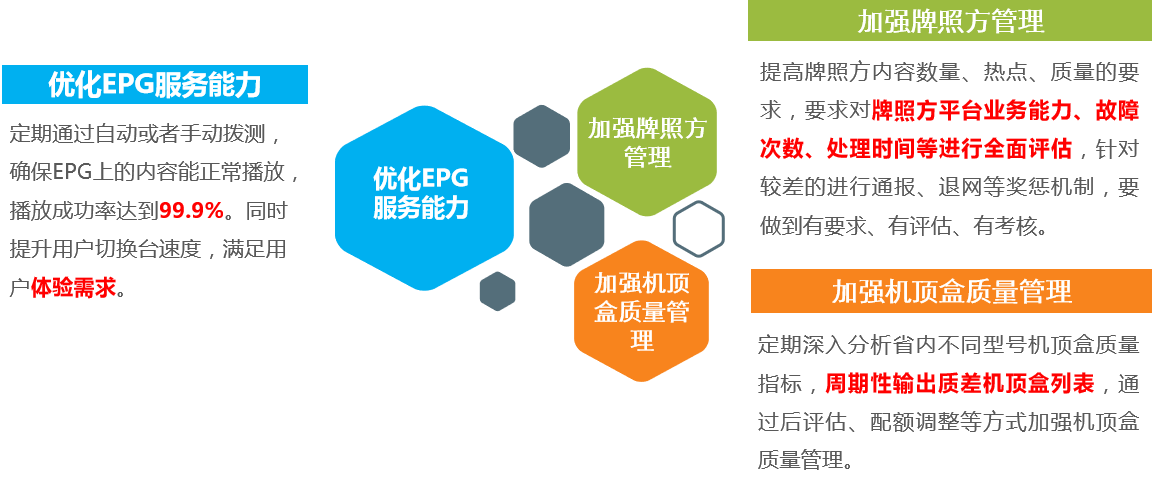 業務質量測評:實現對開機時長、EPG響應、EPG設計、EPG可用率、機頂盒質量等多維度的業務質量測評。可規避不同人之間的感知差異。