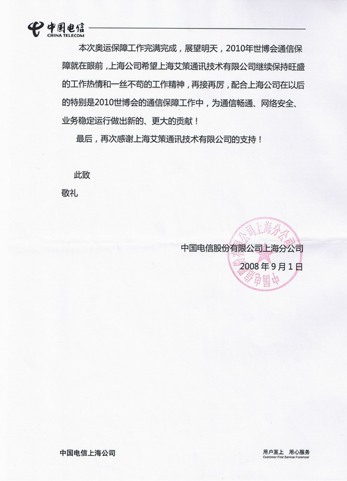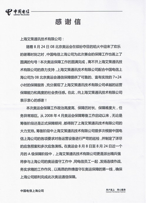 2008年9月26日,中國上海,艾策通訊。隨著2008北京奧運會的結束,各奧運城市的通訊保障也拉下帷幕。為了感謝我司在中國電信上海公司在奧運通訊保障期間所做出的貢獻,日前,上海電信書面函件致謝我司。